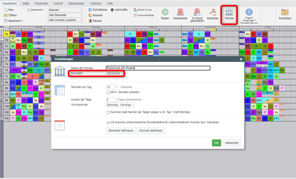 Bevor Sie starten, sollten Sie eine neue Datei erstellen, indem Sie Ihren bisherigen Plan unter einem neuen Namen abspeichern und das Schuljahr (Hauptmenü - Schule) anpassen.