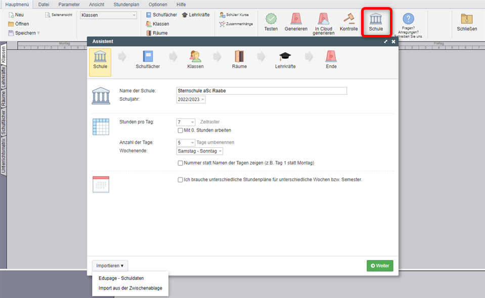 Den Assistenten können Sie im weiteren Verlauf immer wieder manuell öffnen, in dem Sie im oberen Stundenplan Menü auf Schule klicken.