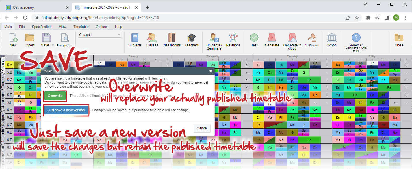 Тази опция презаписва текущото публикувано разписание в EduPage с направените от вас промени.