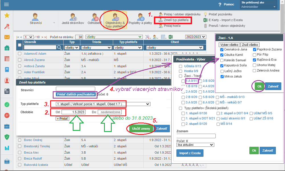 4. 'Stravníci' - cez modré tlačidlo 'Pridať ďalších používateľov' môžete naklikať konkrétnych žiakov - napr. z jednotlivých tried pre daný typ platiteľa
