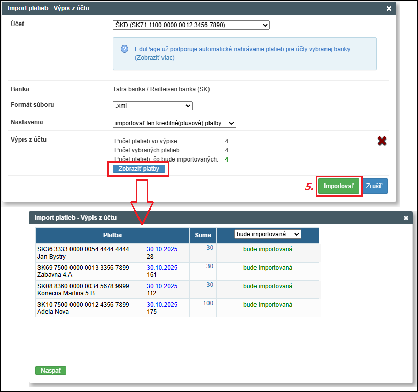 Zobrazia sa nám všetky platby, ktoré sa našli na výpise a budú importované. Cez Zobraziť platby si ich môžeme pozrieť detailnejšie: