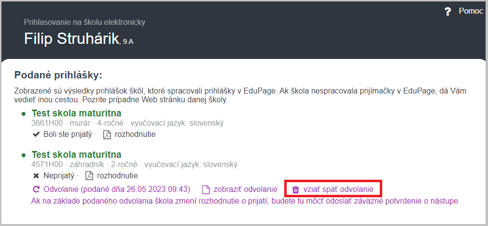 Pri škole, na ktorú ste podali odvolanie máte možnosť odvolanie vziať späť, pokiaľ škola o odvolaní ešte nerozhodla.