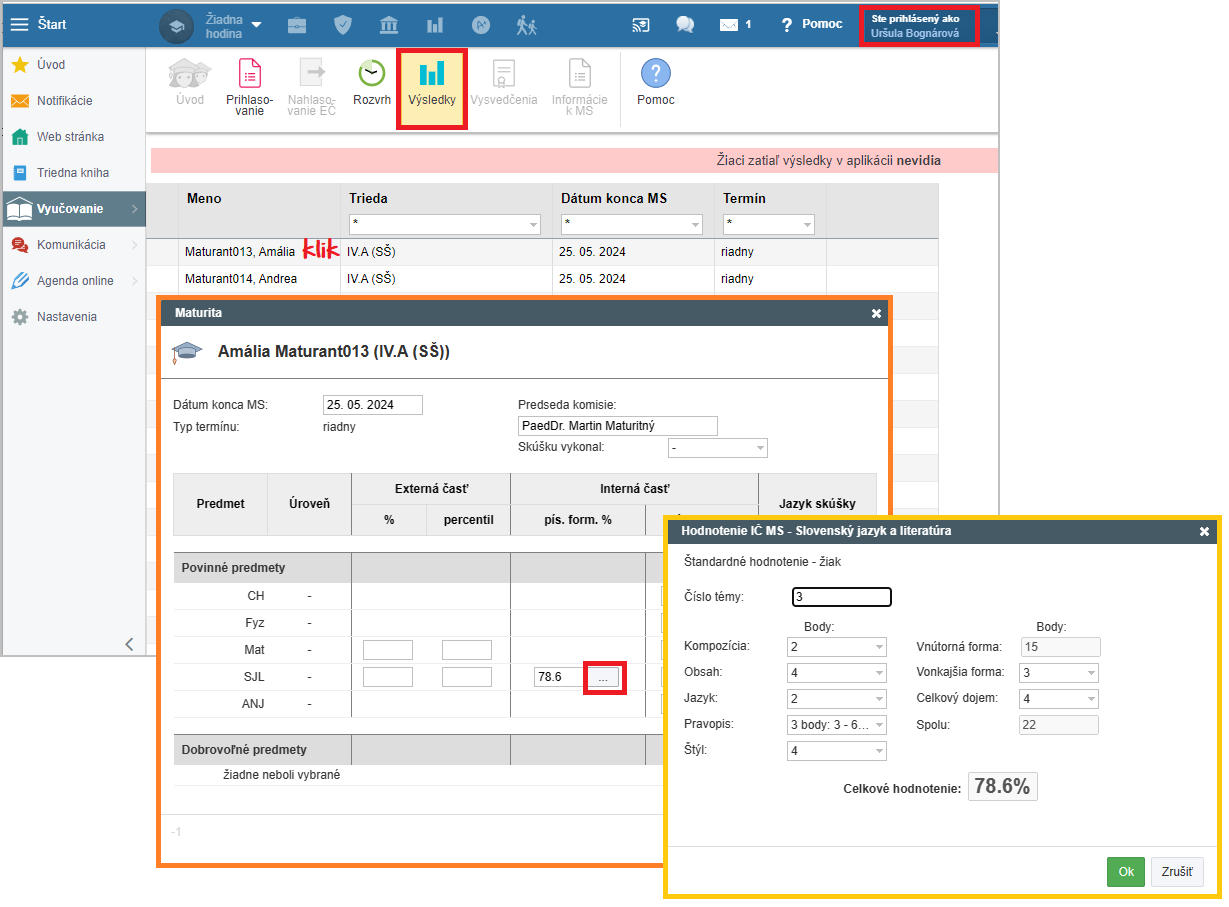Učiteľ s týmto používateľským právom má potom prístup do modulu Maturita a v časti Výsledky vie zapisovať čiastočné výsledky pre PFIČ, ÚFIČ priamo v EduPage: