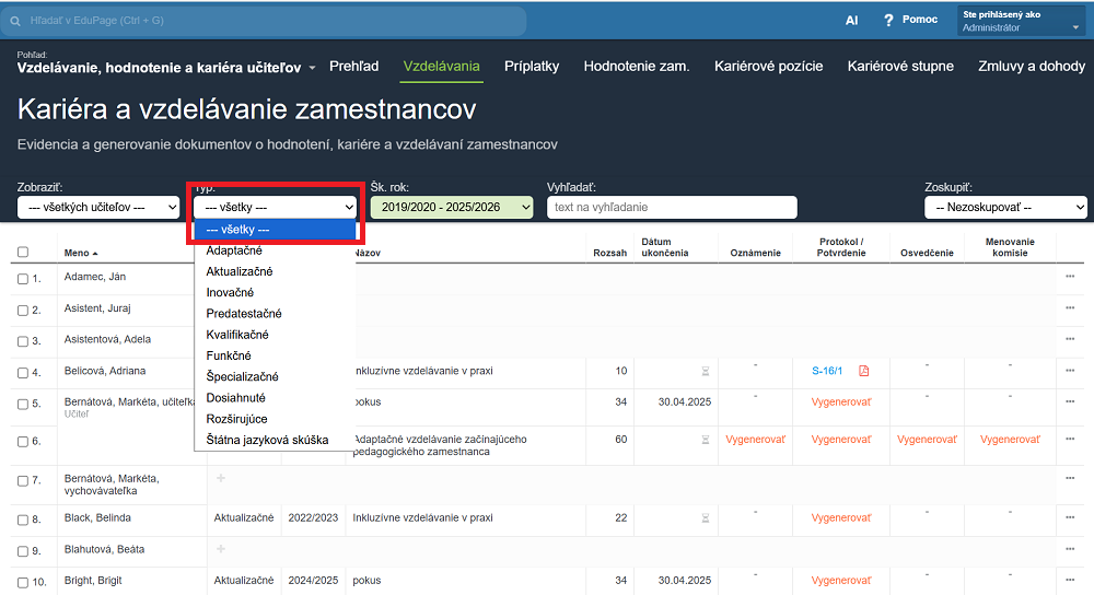 V pohľade Vzdelávanie vidíte zoznam všetkých zadaných vzdelávaní a viete si vyfiltrovať zoznam podľa typu vzdelávania.