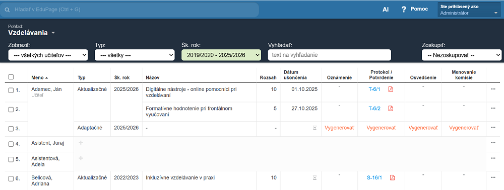 V pohľade Vzdelávania vidíte zoznam všetkých zadaných vzdelávaní učiteľov a viete ich vyfiltrovať podľa typu vzdelávania.