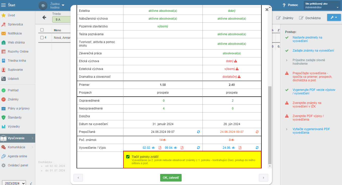 Potvrdením zabezpečíte aby sa daný polrok na vysvedčení vyčiarkol.