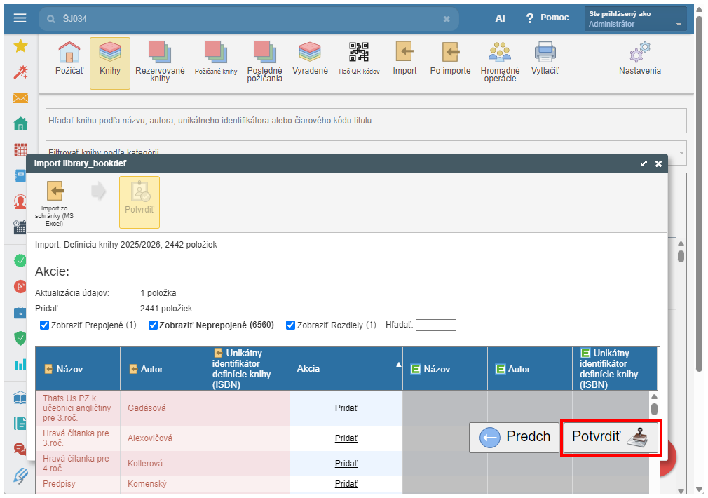 Zobrazí sa tabuľka importovaných údajov s možnosťou voľby Akcie - rozhodnutia, či sa majú predmetné položky importovať, alebo nie. Voľbu môžete realizovať kliknutím na podčiarknutý text v stĺpci "Akcia". V prípade, že je všetko v poriadku, zvoľte "Potvrdiť". Údaje budú importované do vašej EduPage Knižnice.