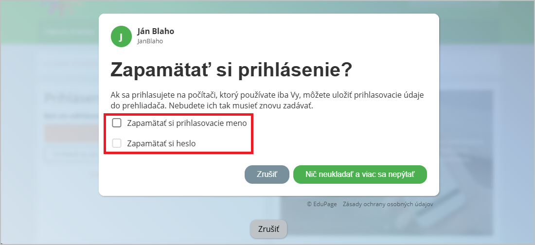 Po príhlásení sa môžete zvoliť možnosť zapamätať si prihlasovacie meno, prípadne aj heslo. To však odporúčame iba na počítači, ktorému naozaj dôverujete. Napr. ak sa jedná o váš domáci počítač.
