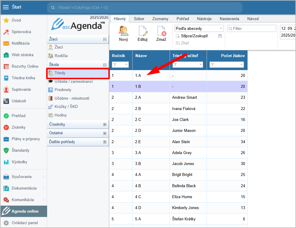 V Agende online kliknite na triedy. Dvojklikom si otvorte triedu, ktorej chcete nastaviť triedneho učiteľa.