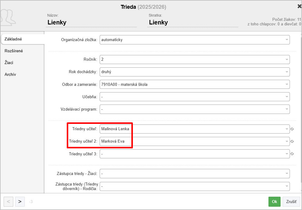 V MŠ má trieda obvykle 2 pani učiteľky. Aby mali obe rovnaké práva na triedu, treba obe zadať ako triedne učiteľky.
