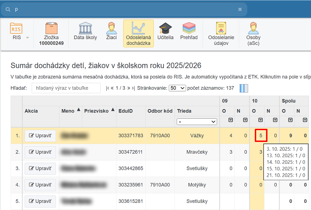 Údaje o dochádzke detí sa do RIS odosielajú automaticky z Dochádzky žiakov v ETK. Nie je potrebné nič meniť ani dopĺňať.