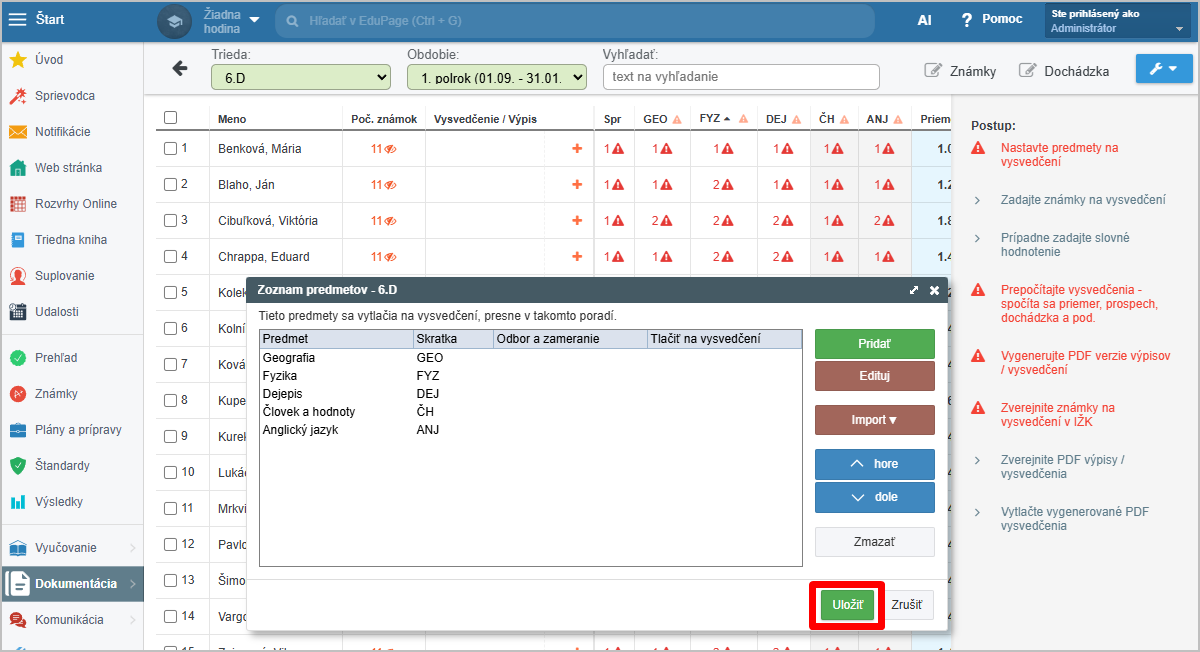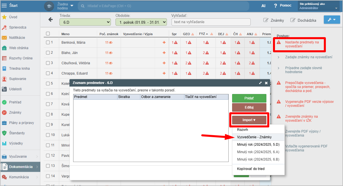 Pri nastavovaní predmetov zvoľte Import a vyberte import "Vysvedčenie-Známky".