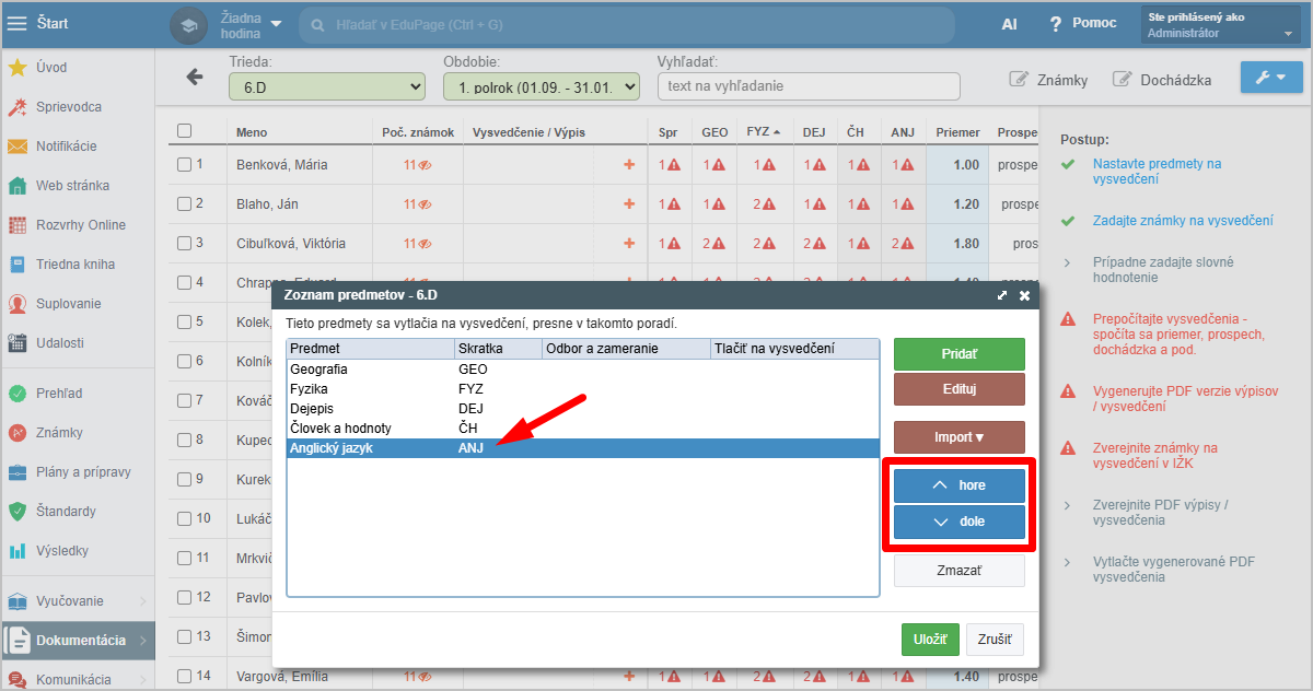 Ak chcete upraviť poradie predmetov, nastavte sa na predmet a šipkami hore-dole upravte jeho pozíciu.