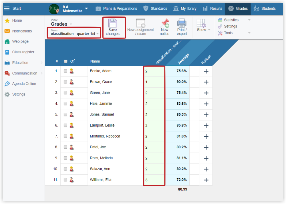 A new "classification - quarter 1/4" column displays. Input the half-term grades in this column. Save changes.