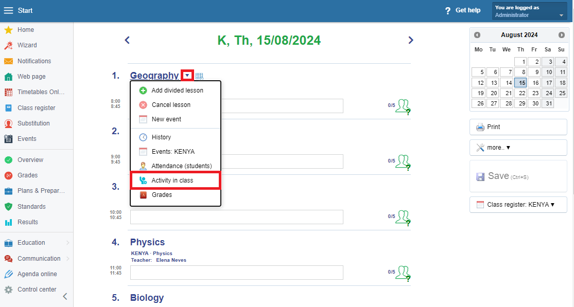 In the Teacher's Notebook, select Activity in Class from the dropdown menu.