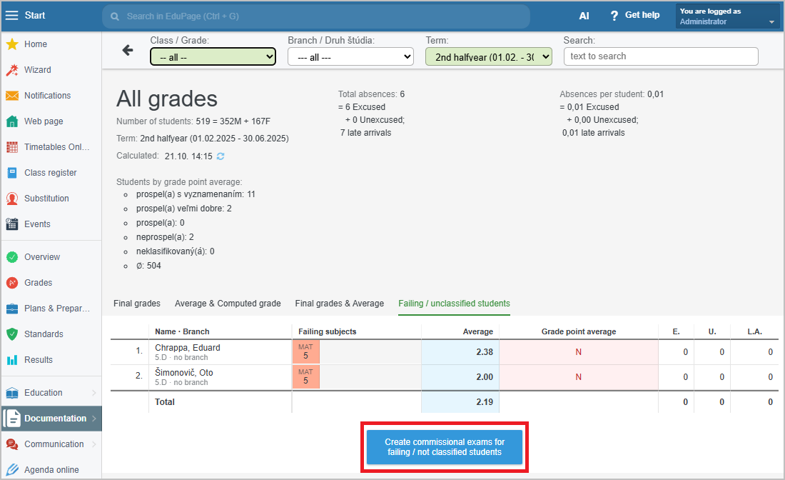 An overview of all failing and unclassified students across the entire school will be displayed.