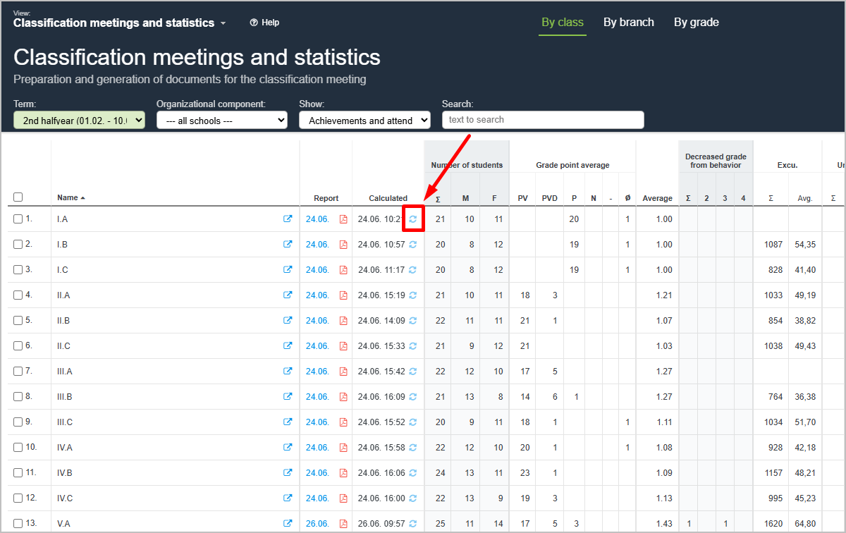 You can recalculate the statistics for a specific class by clicking the icon shown in the image. In the Recalculated column, you will see the date and time when the data was last recalculated.