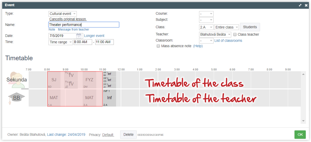 - select "Cancels original lesson" in the timetable (if you use class register and you wish the name of the event to display in the class register instead of the ordinary lessons from the timetable)