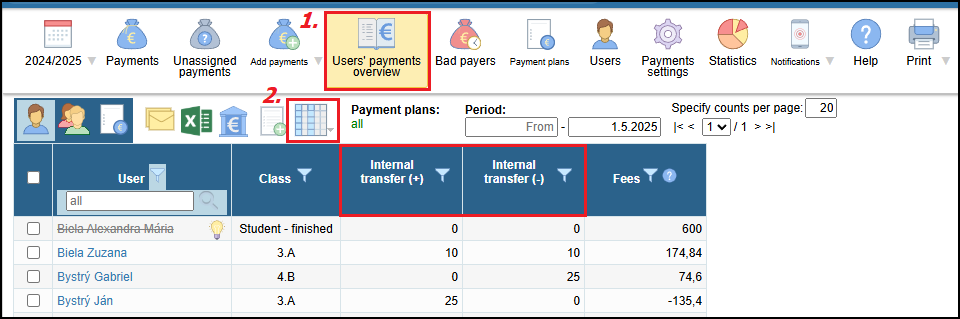 In our example student Bystrý Gabriel has an overpayment from the school club (he cancelled attending of the school club). This overpayment can pay the fee of his brother Ján so we used the internal transfer to do this.