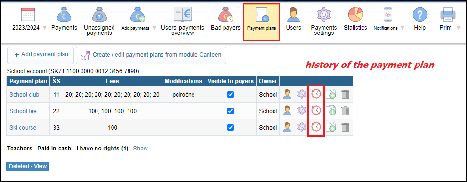 To display deleted payment plan click on Deleted-View. You will see the list of deleted payment plans. Clicking on the figure icon you can display the list of payers with fees. Clicking on the gear icon you can display the settings of payment plan and you can restore the payment plan clicking on Save changes (Restore).