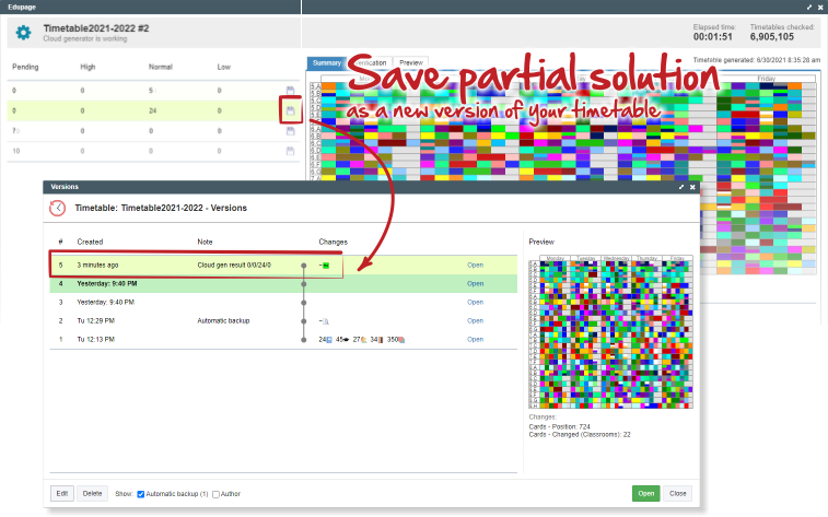 You can click on any result to see the preview of the timetable and the actuall constraints that were relaxed: