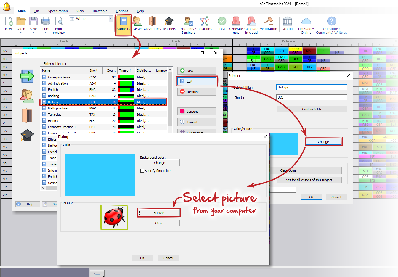 - aSc TimeTables comes with a collection of pictures located in 'Subject pictures' directory, but you are free to find your pictures in your collections or on the internet.
