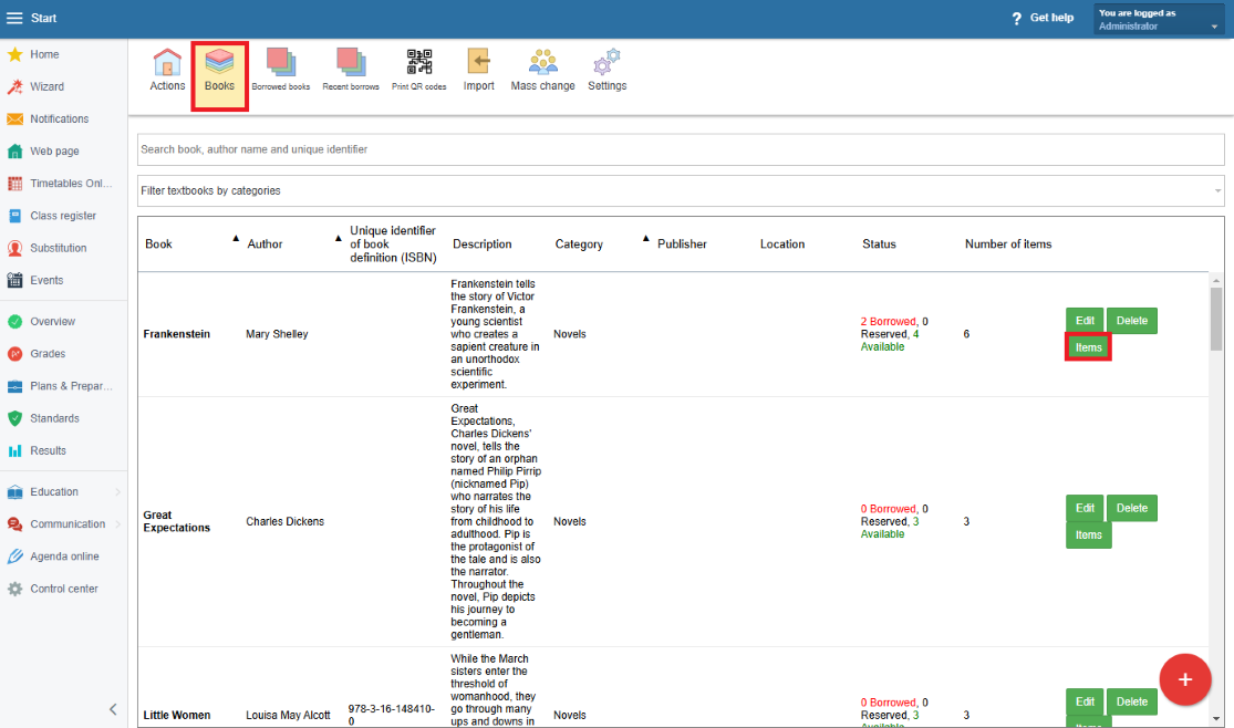 In the Library/Textbook Storage module, select the Books/Textbooks icon in the top menu.