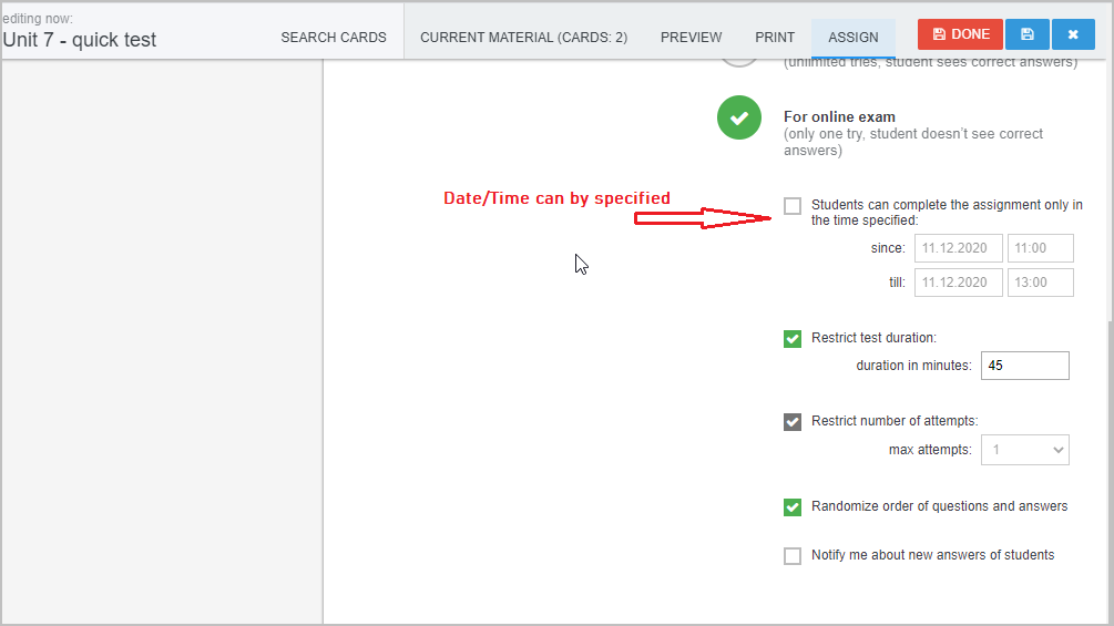 - You may specify date and time of the exam. This functionality specifies a time period in which the students can elaborate online test/homework not a time period in which they are able to start to work on it only. (E.g. when a student starts at 8.50am and the allotted time is 8am - 9am, they have only 10 minutes to complete it.)
