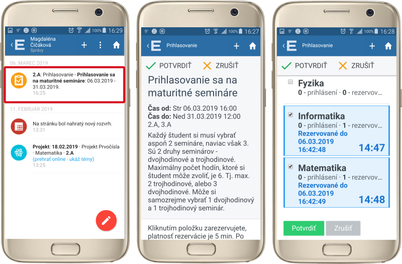 Students are notified about a new registration action via notification on the web page or in the mobile application. Parents are notified too.