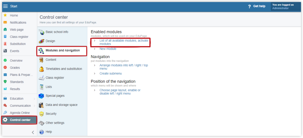 Jūsų mokyklos tinklalapio moduliai gali būti įjungti arba išjungti. Pasirinkite iš modulių sąrašo arba sukurkite savo. Visų galimų modulių sąrašą galima rasti Valdymo centras / Moduliai ir navigacija / Galimų modulių sąrašas, įjungti moduliai.