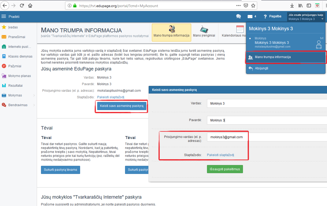 Prisijungimo vardą ir slaptažodį galite pakeisti savo asmeninėje „EduPage“ paskyroje: