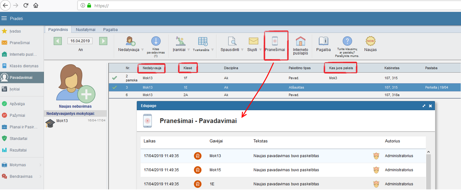 Visi asmenys (mokytojai, moksleiviai), kuriuos liečia pavadavimai, gaus pranešimą apie tvarkaraščio pokyčius.