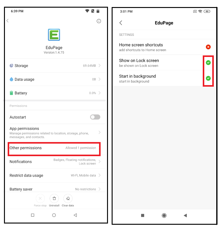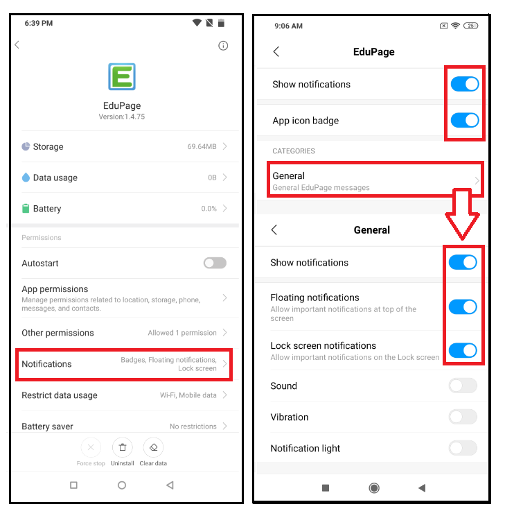 „Xiaomi“ įrenginiuose tiesioginiai pranešimai (Push notifications) pagal pradinius nustatymus yra neleidžiami. Gamintojas juos išjungia ir atnaujinus MIUI sistemą. Norėdami vėl juos įjungti, eikite į telefono nustatymus ir ieškokite „EduPage“ prie įdiegtų programų.
