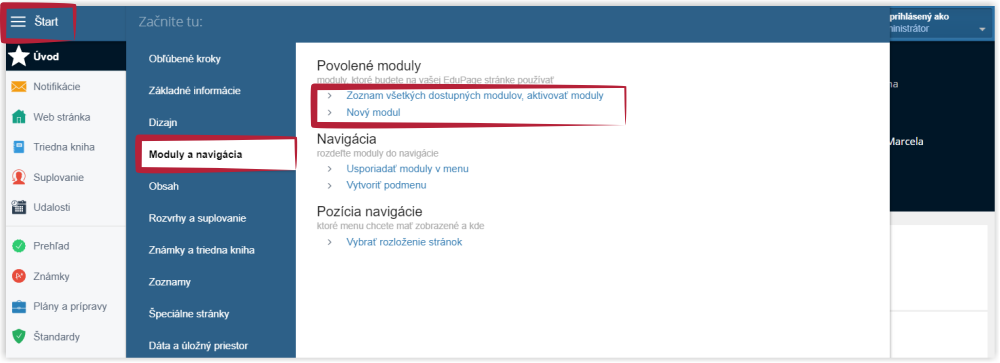 Stlačte tlačidlo Štart v ľavom hornom rohu, vyberte Moduly a navigácia a Nový modul.