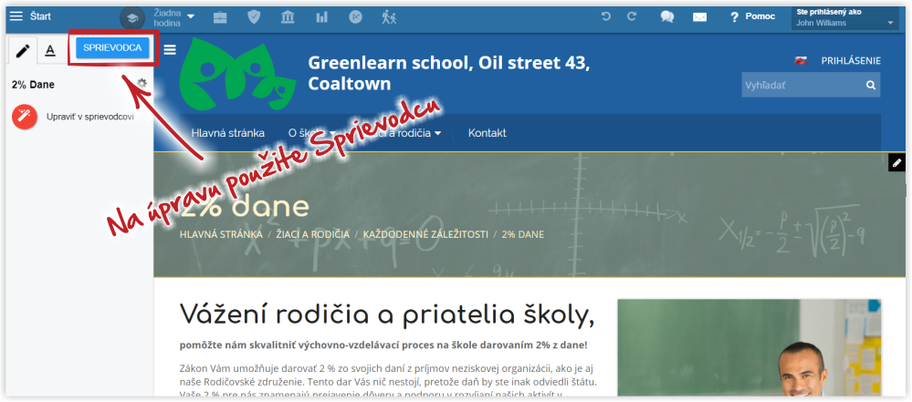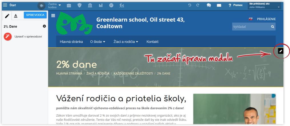 Upraviť vzhľad a obsah modulu môže okrem administrátora aj učiteľ s právom na úpravu webstránky, alebo s právom na úpravu konkrétneho modulu. Ukážeme si to na príklade modulu 2%.