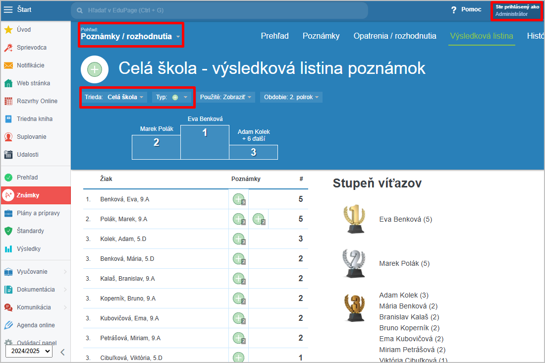Rebríček bodov za celú školu si môže zobraziť administrátor v module Poznámky/rozhodnutia.