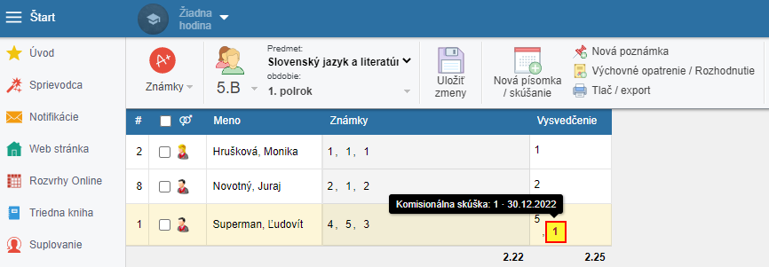 Po vygenerovaní známok na vysvedčenie sa zobrazuje už len známka z komisionálnej skúšky: