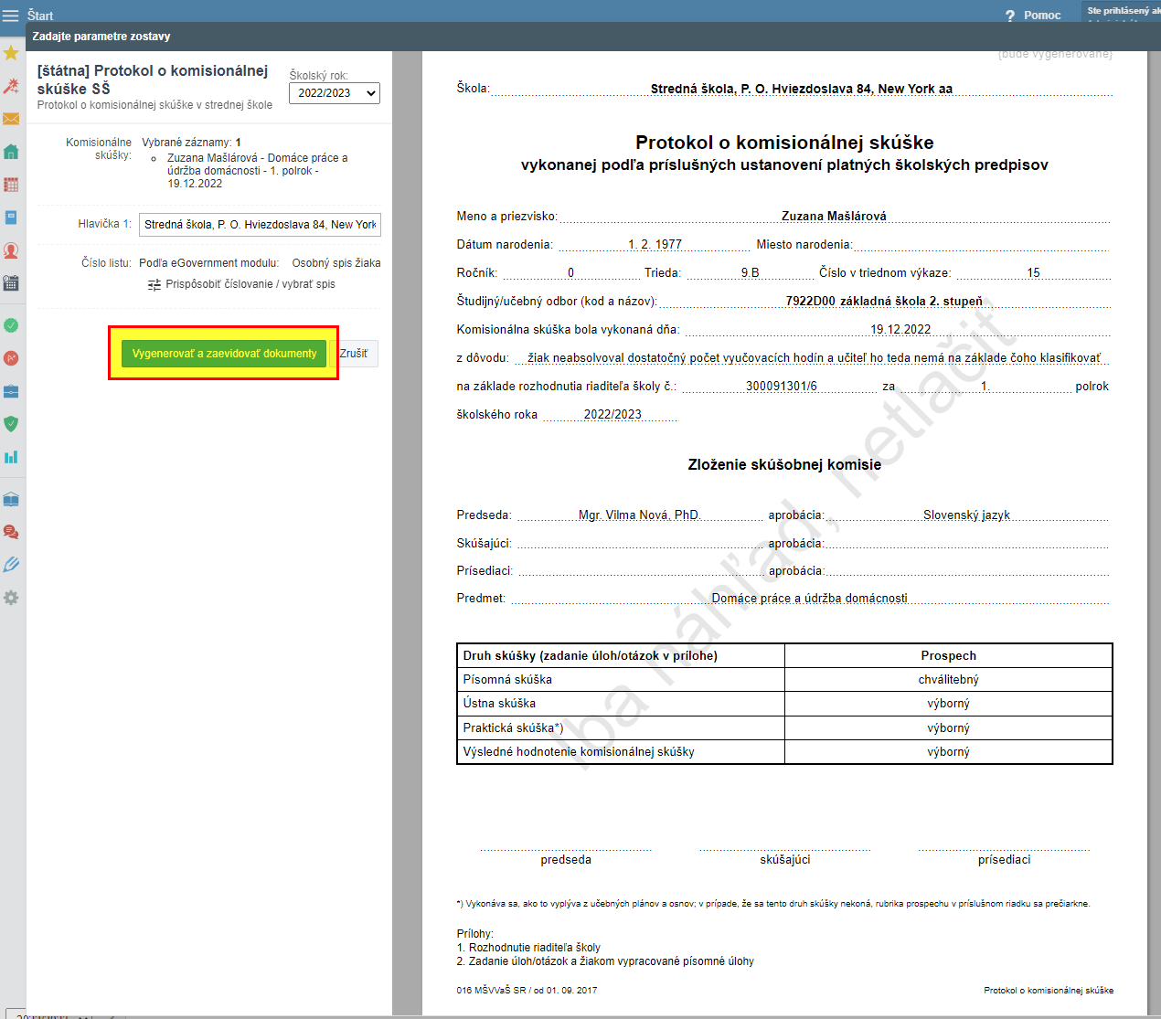 Uvidíte náhľad protokolu. Kliknite na "Vygenerovať a zaevidovať dokumenty".