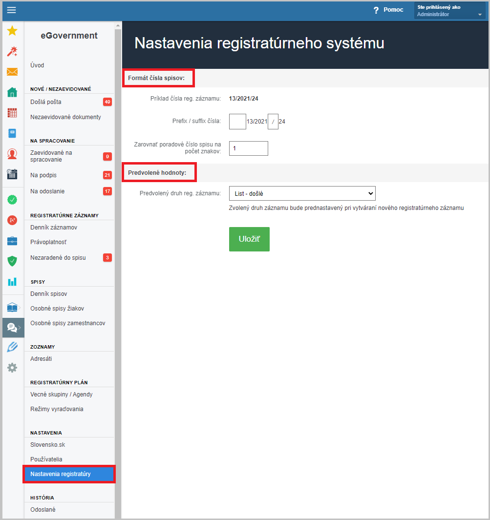 Ako si nastavím formát číslovania spisov