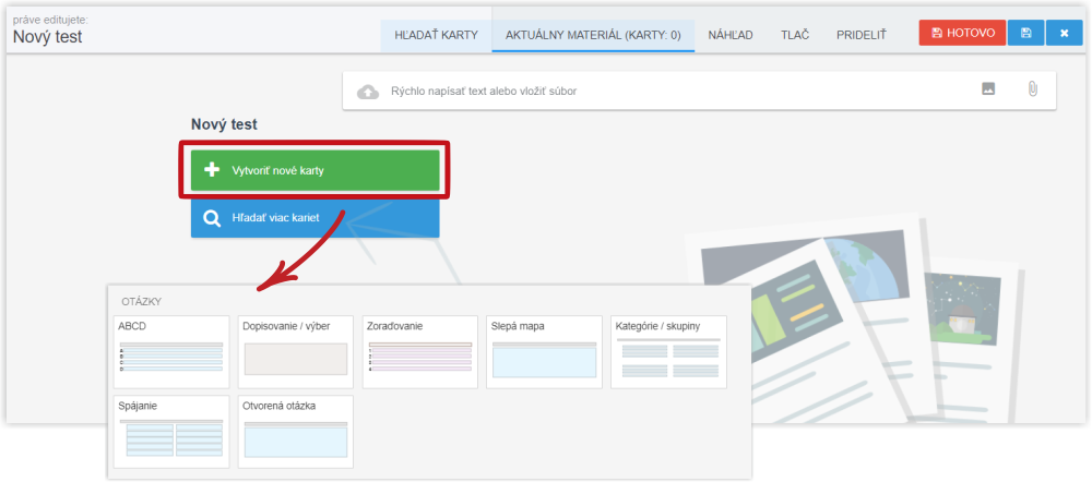 Pokiaľ si chcete do testu vyrobiť nové otázky, zvoľte tlačidlo "Vytvoriť nové karty". Ako pripraviť novú otázku?
