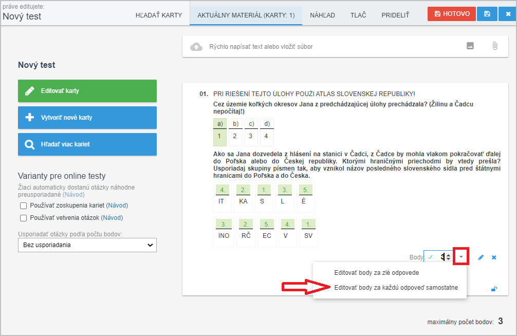 Keď pripravujete test, v záložke Aktuálny materiál môžete pri každej otázke nastaviť počet bodov.