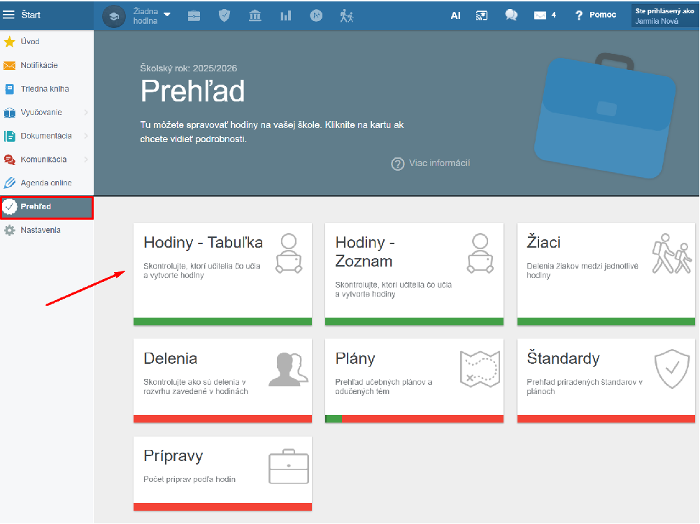 Učiteľovi sa následne v ľavom menu zobrazí tabuľka na administráciu všetkých "mojich hodín" na škole: