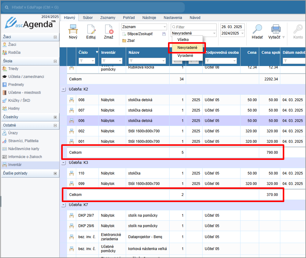 Z vášho zoznamu inventáru je možné zobrazovať Všetky položky, Nevyradené, alebo Vyradené položky so zodpovedajúcimi súčtami.