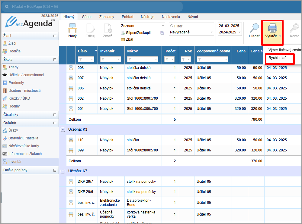 Ako si zoskupiť inventárne položky napr. podľa učebne?