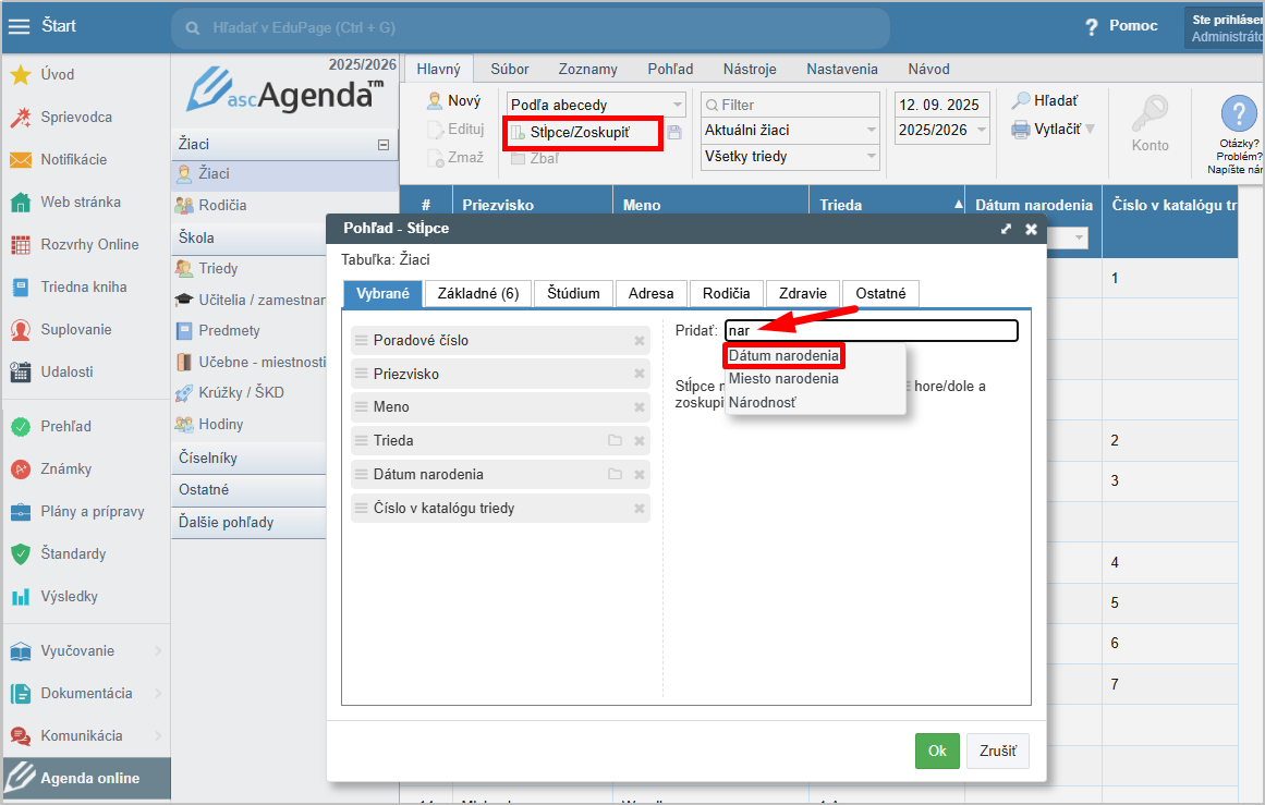 V hornom menu Hlavný vyberte Stĺpce/Zoskupiť a do políčka začnite písať čo hľadáte. Systém ponúkne všetky políčka, ktoré obsahujú zadaný reťazec. Kliknutím vyberte z ponuky položku, ktorú potrebujete.