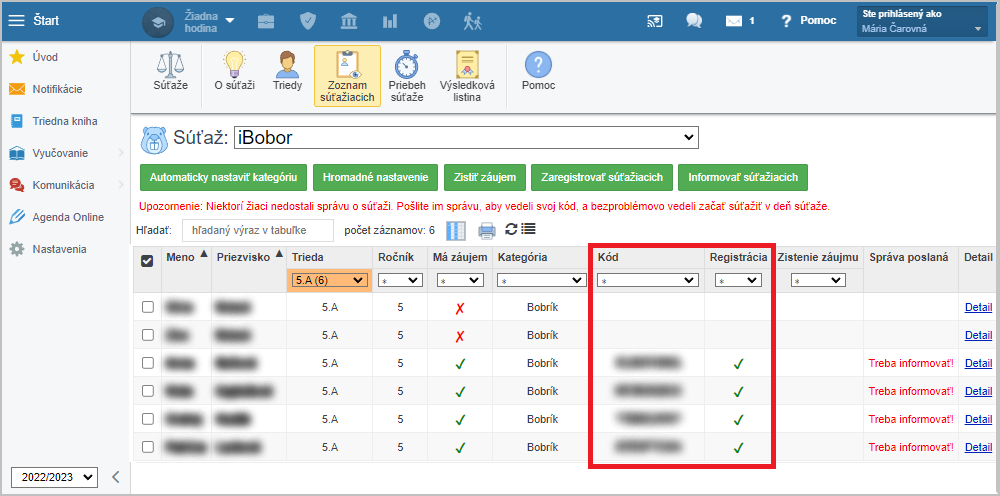 Takto ste zaregistrovali zvolenú triedu do hlavnej súťaže a v pohľade Zoznam súťažiacich vidíte súťažný kód žiakov: