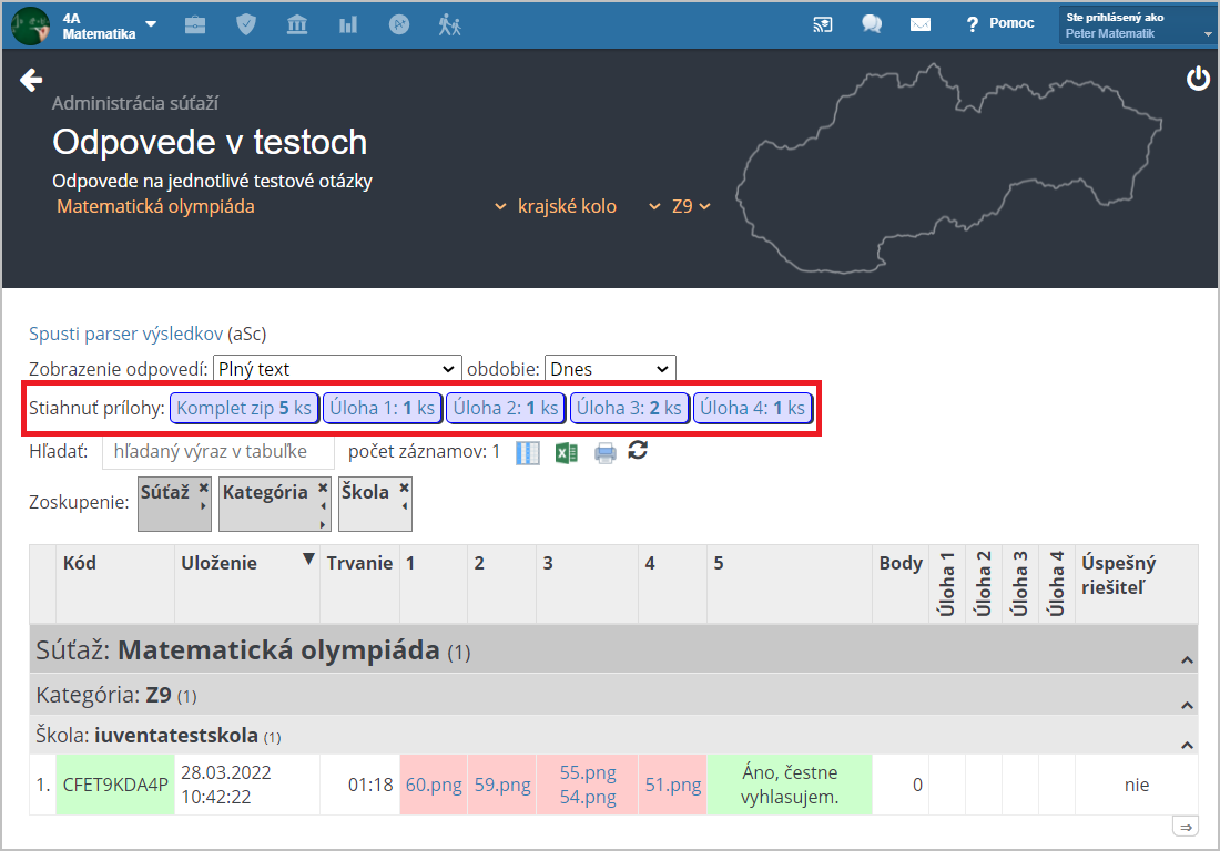 Pozn: V našom príklade odovzdal súbory len 1 žiak, na normálnych okolností tu uvidíte súbory všetkých žiakov, ktorí odovzdali svoje riešenia cez online test a tieto si viete stiahnuť naraz.