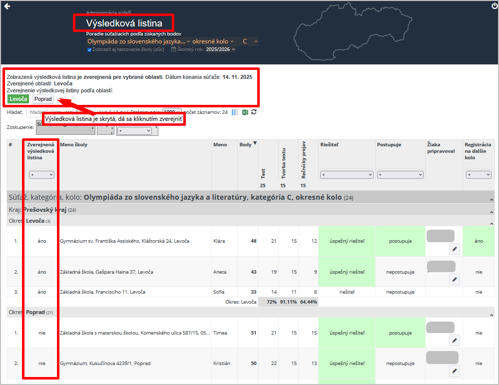 Ak je VL zverejenná, nie je možné dopĺňať/ meniť zápis získaných bodov jednotlivých súťažiacich v časti Zadávanie bodov. V prípade potreby zmeny bodov je potrebné najskôr listinu odzverejniť. Po ukončení kola budú listiny zverejnené centrálne a nebude už možné zverejňovanie lisín po oblastiach a teda nebude možná zmena zapísaných bodov organizátormi.