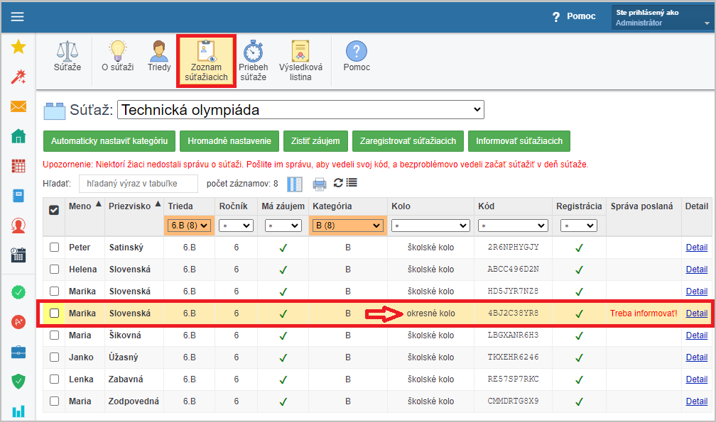Po úspešnom zaregistrovaní sa žiakovi automaticky vytvoril nový záznam pre vyššie kolo súťaže, vidíte ho v časti Zoznam súťažiacich: