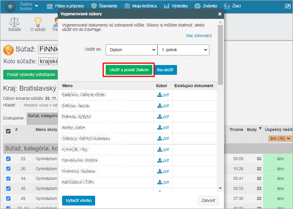 Systém pripraví PDF súbory s diplomami. Stlačením tlačidla "Uložiť a poslať žiakom" rozošle diplomy cez EduPage. Ak zvolíte len Uložiť, diplomy sa žiakom neodošlú.